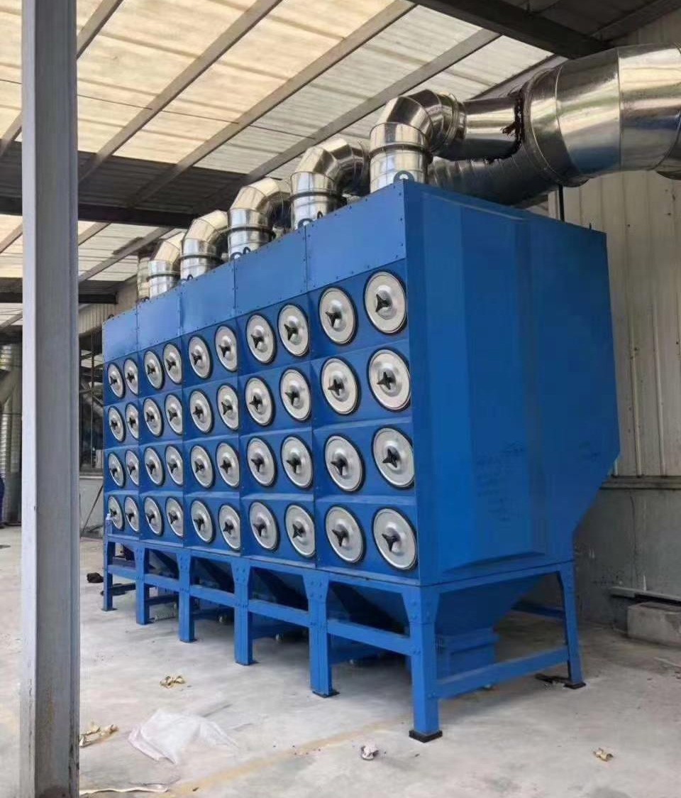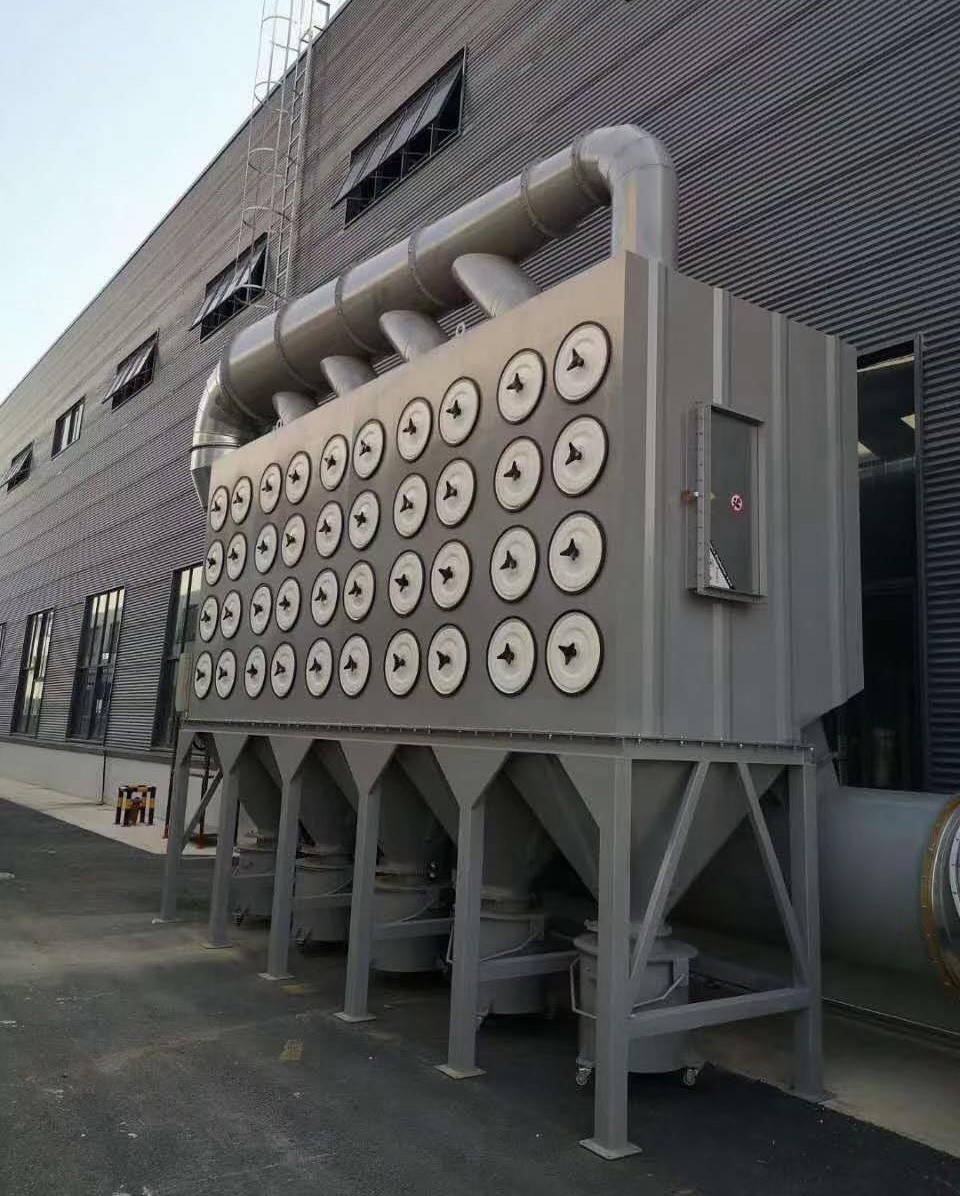 而較細(xì)粉塵均勻地進(jìn)入中部箱體而吸附在濾筒的外表面上,干凈氣體透過濾筒進(jìn)入上箱體,并經(jīng)各離線閥和排風(fēng)管