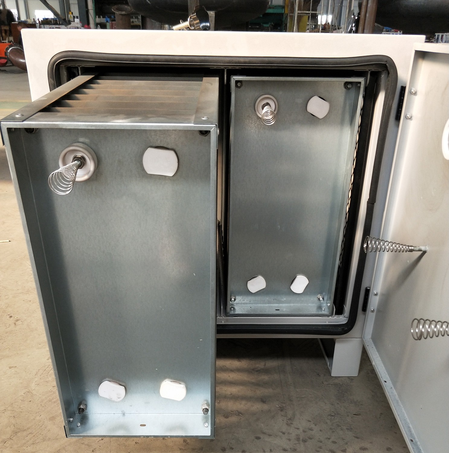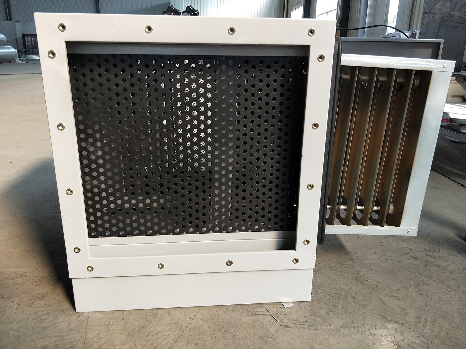 大顆粒油滴通過前擋板在自身重力作用下流入油槽排出。剩余的小粒徑污染物進入離子高壓靜電區(qū),通過